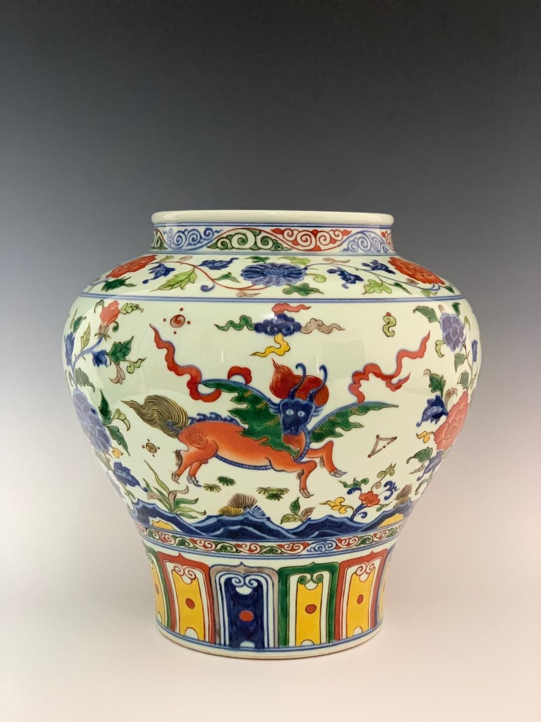 明 宣德 ▎ 麒麟花卉海紋鬥彩罐