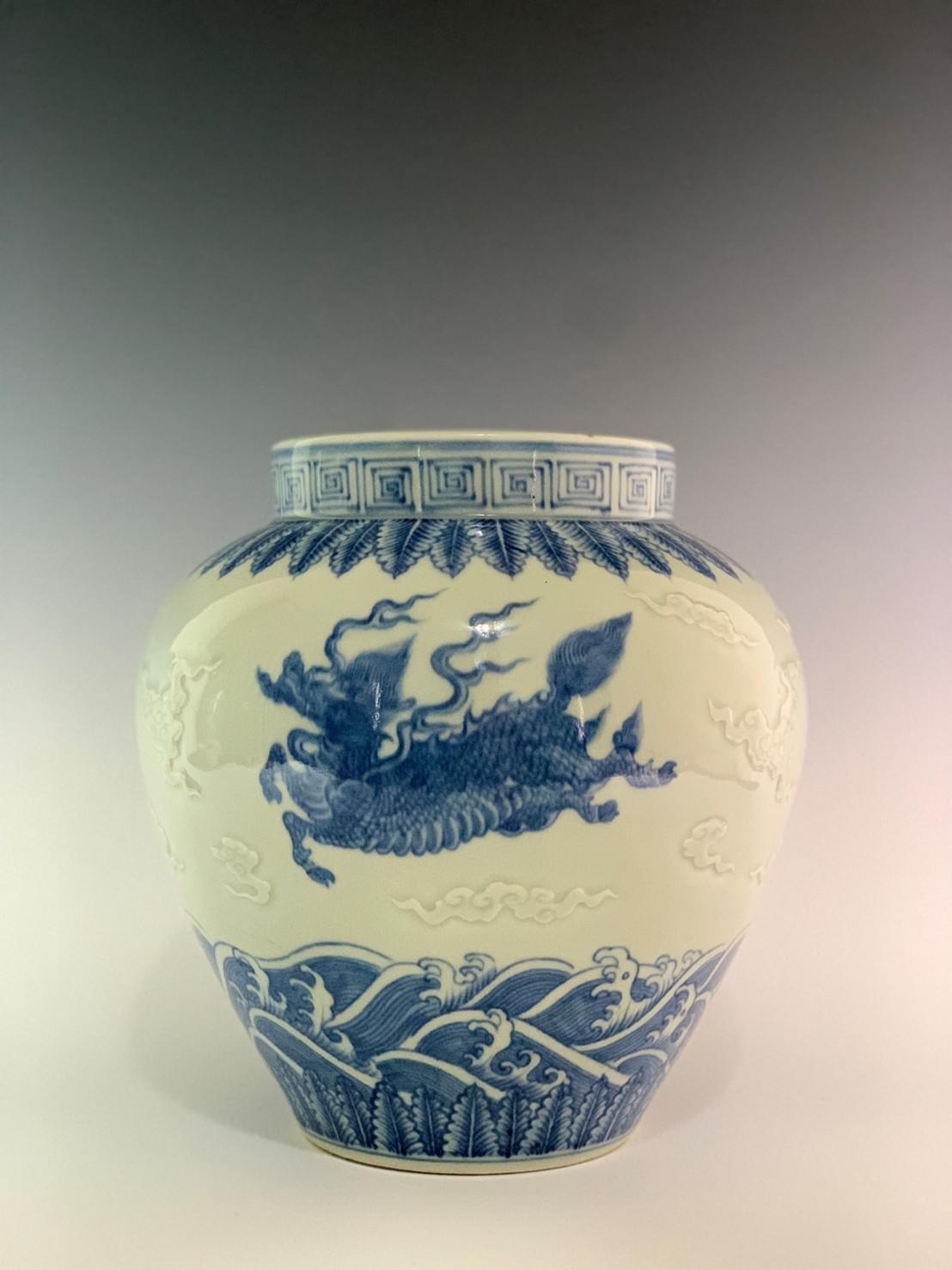 腹部畫一條麒麟於雲朵間,麒麟作飛馳狀,四蹄在空中張開,睜眉瞠目,炬眼炯炯,張牙舞爪,剛勁有力。麒麟紋寓意著吉祥,事業成功。雲朵為浮雕工藝,邊緣分明,立體感強。其下為浪花紋,具有水波蕩漾,巨浪橫空的動態美。