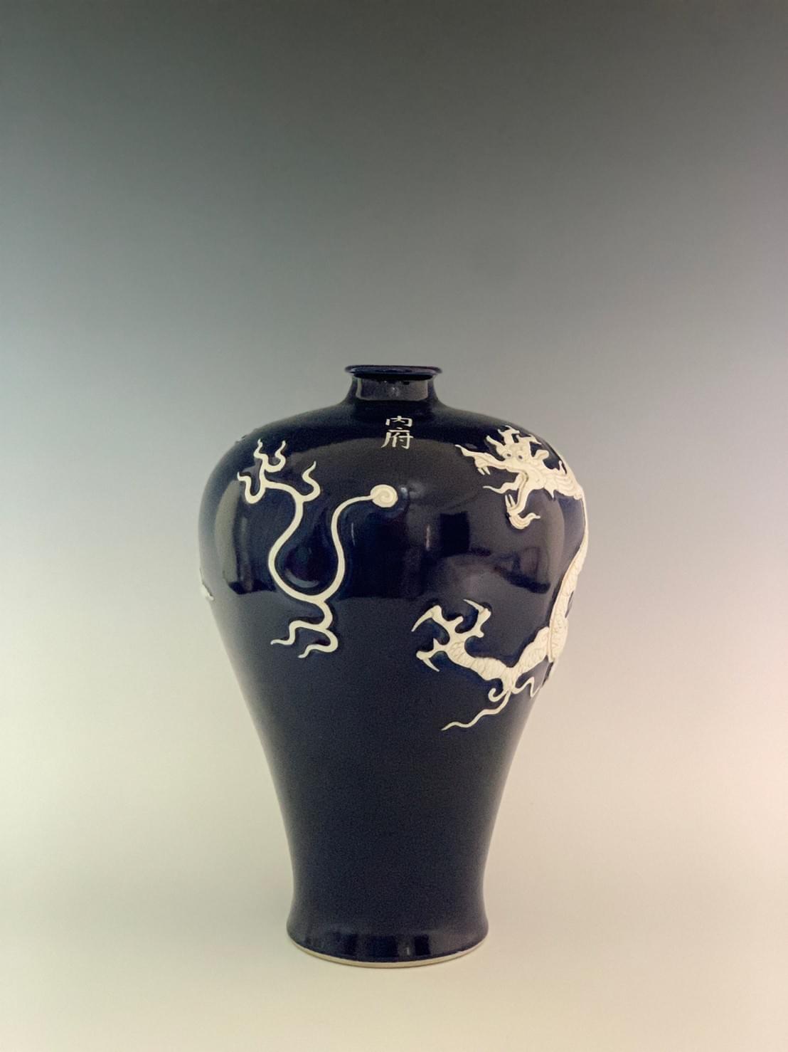 ▎落款:大元國國成吉思汗萬歲萬歲萬萬歲 ▎藍釉瓷雕白龍紋梅瓶