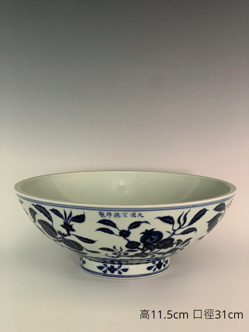 此石榴繪畫細膩真實,採用雙勾填色,巧妙地利用青花色澤的深線變化,使得紋飾的質感強烈,顯得極為自然,青料為進口蘇麻離青,色澤清晰明快。