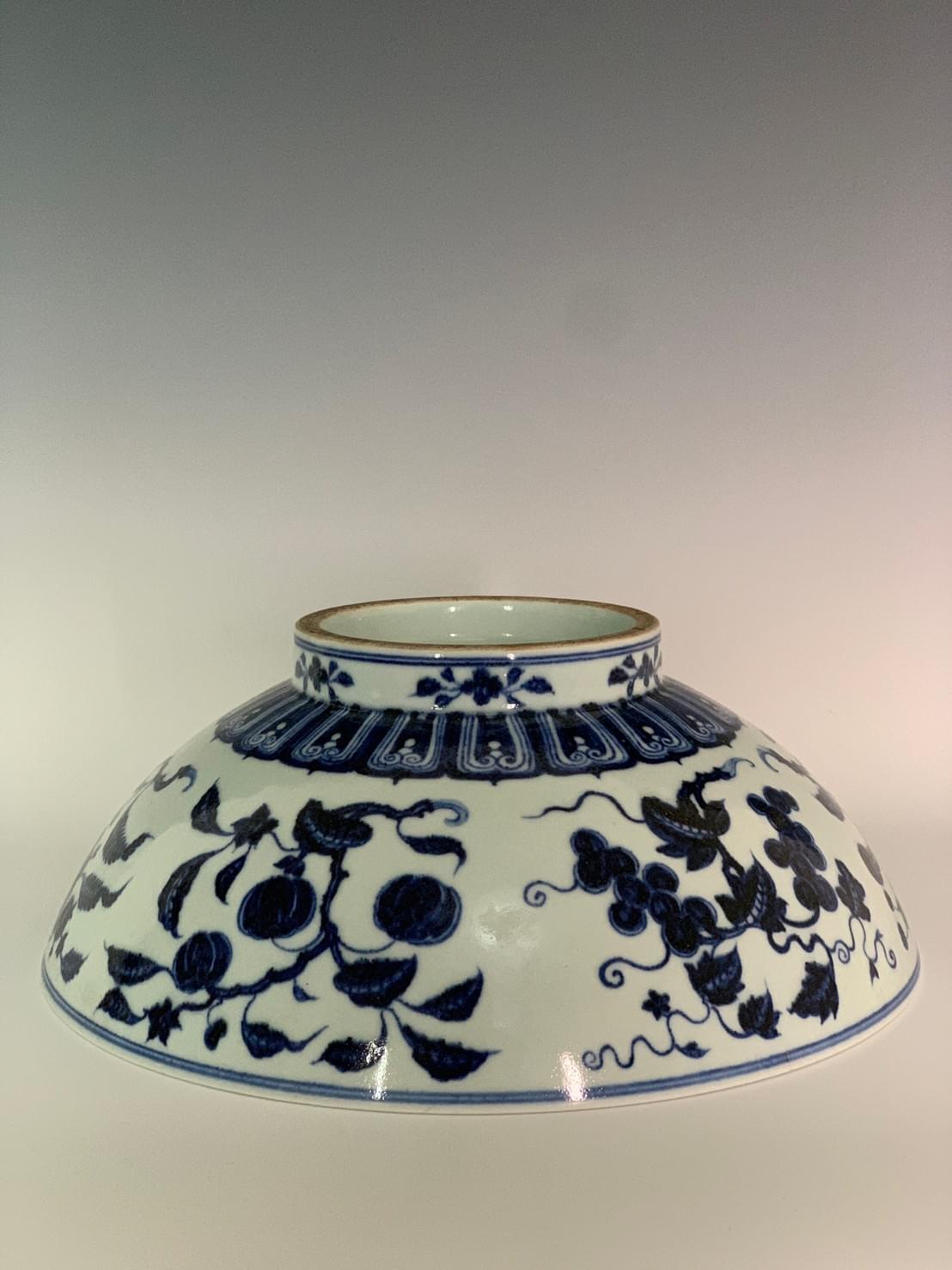 碗內部釉質細膩,正常光照下可見瑩潤光澤。碗口沿外側橫書“大明宣德年制”6個正楷字,是青花瓷器中之代表,亦是明代青花瓷之珍品。
