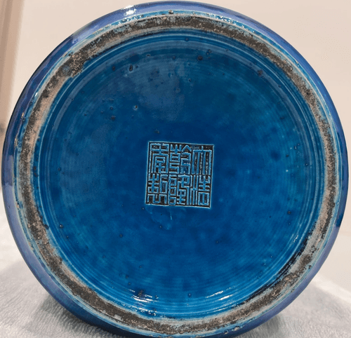 直身平底,底部有“大清乾隆年制”的篆體字樣。藍釉色澤深沉,肥腴溫潤,玻璃質感強烈,如藍寶石般晶瑩透亮。