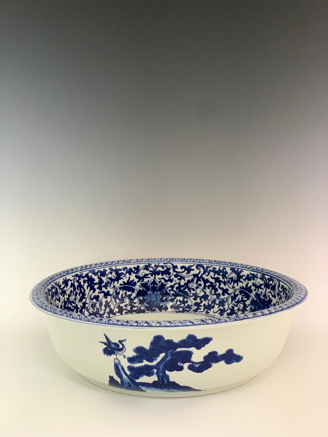 盆身外側繪梅、竹、松三君子,碧鳥頌梅、修林茂竹、松聲鶴唳。盆身外側的留白與盆腹內壁的密紋對比又互補,在外看來清麗素雅,內裡卻別有洞天。