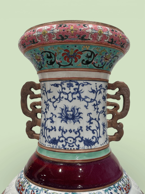 本品器型宏偉高大,洗口、長頸、頸兩側各置一金釉螭龍耳,鼓腹、圈足。其工藝之複雜冠絕古今,通體由上至下使用了包含粉彩、琺瑯彩、霽藍釉、仿汝釉、仿官釉、仿哥釉、青花、祭紅釉等十五種以上的不同釉彩工藝。
