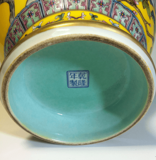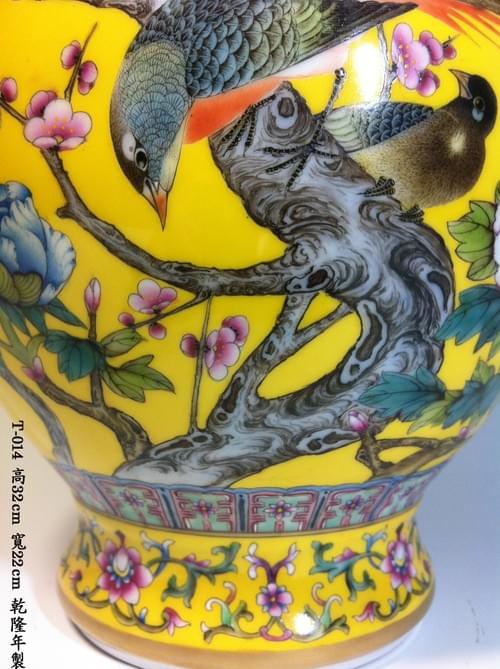 清乾隆 黃地粉彩花鳥紋雙耳瓶 (落款:乾隆年製)