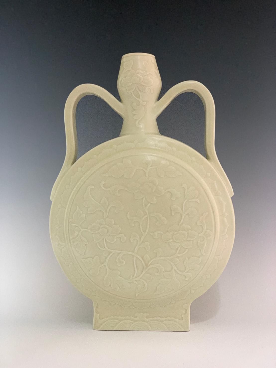 用料為一卵白釉,雙耳扁瓶,蒜頭口,束頸,圓形扁腹。瓶頸左右兩側與肩部有花瓣狀雙耳相連,似雙臂抱月。全器釉面平整勻淨,玻璃質感極強,圓腹光滑似水滴;瓶底無釉,方形底足,底部有“官”字款識。