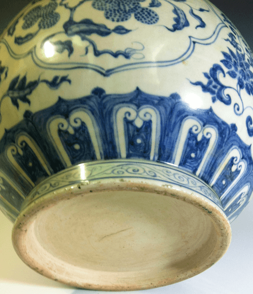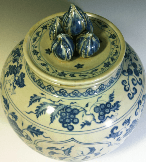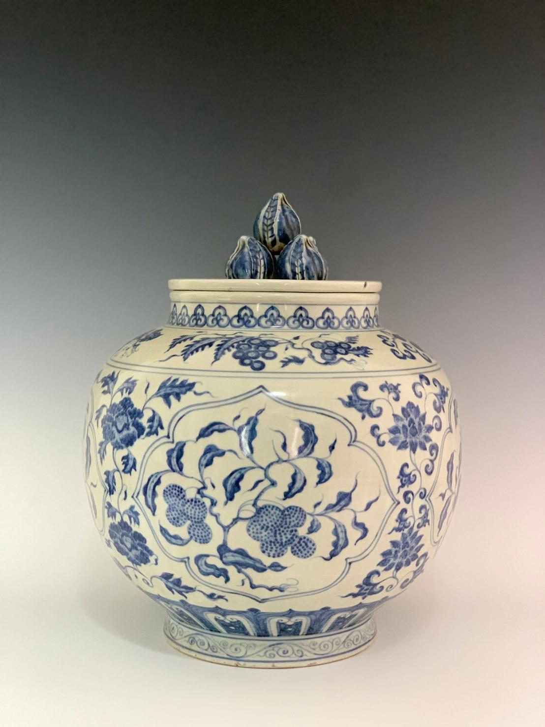 此蓋罐形制渾厚、飽滿,紋飾工整、細膩,畫意疏朗,古樸典雅,筆法流暢,白釉肥潤細膩,青花色澤濃豔,深入胎骨,為青花之典型作品。